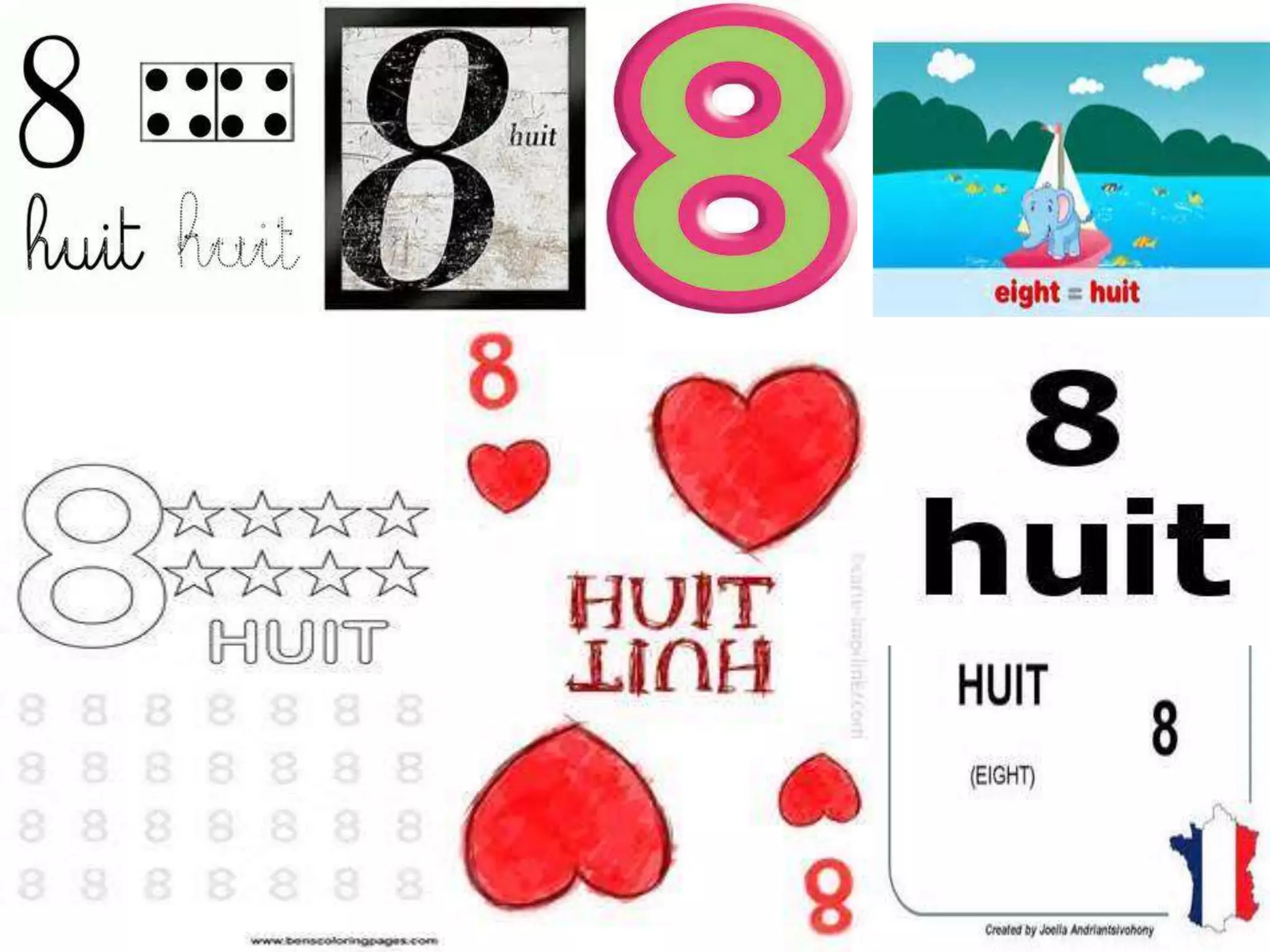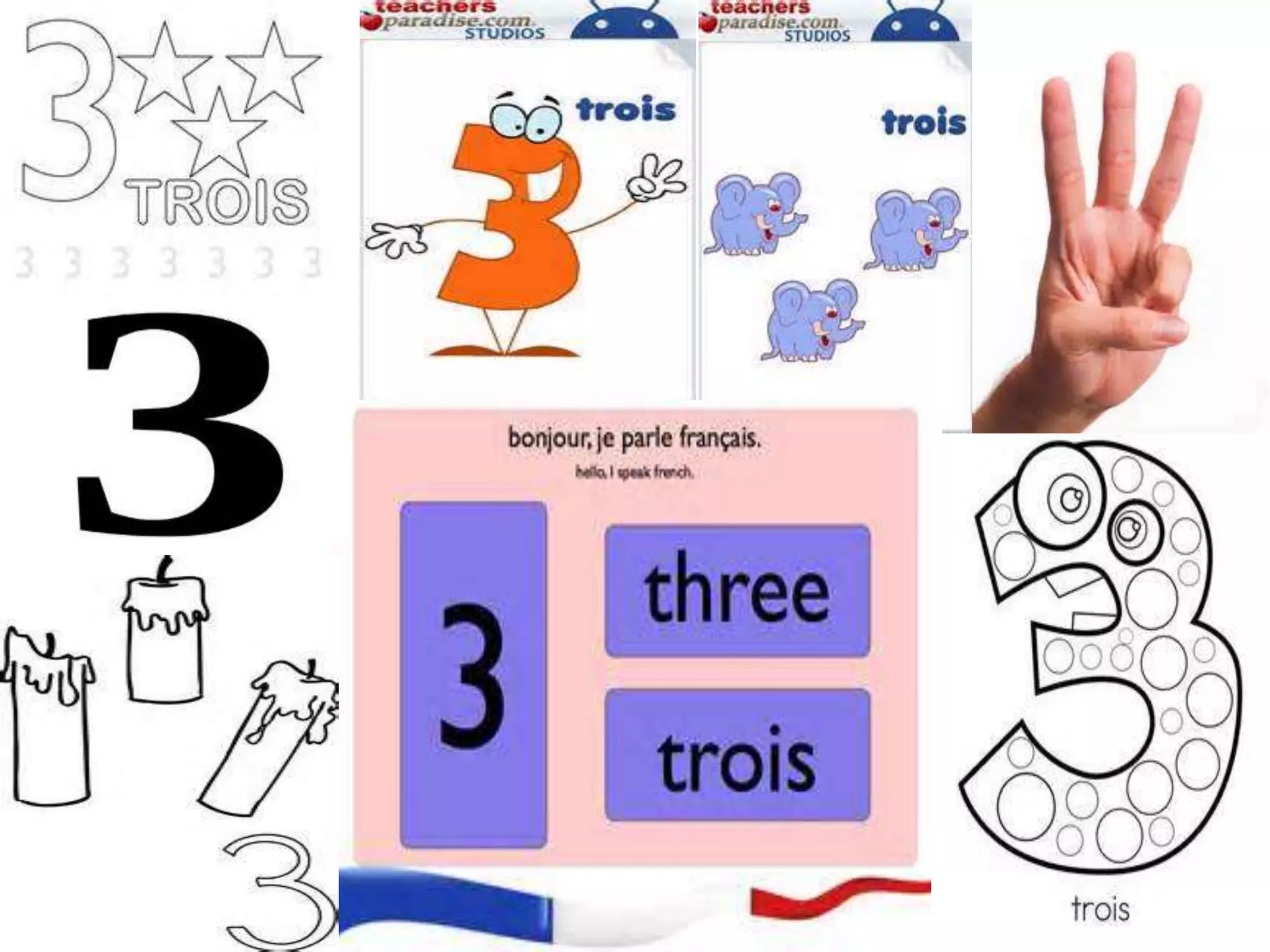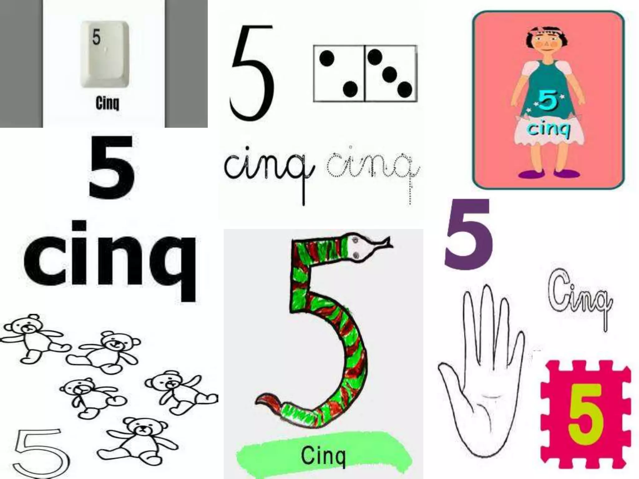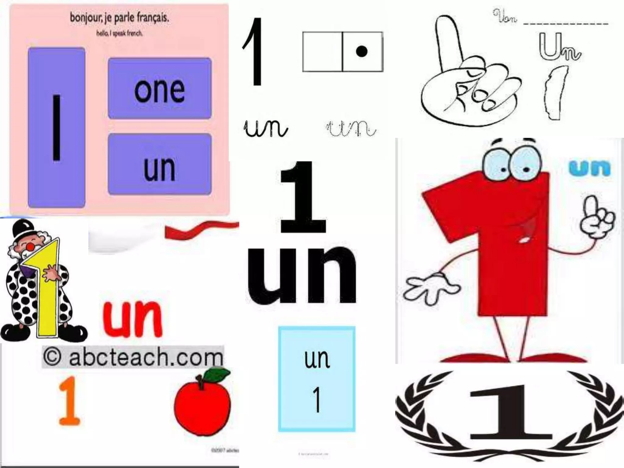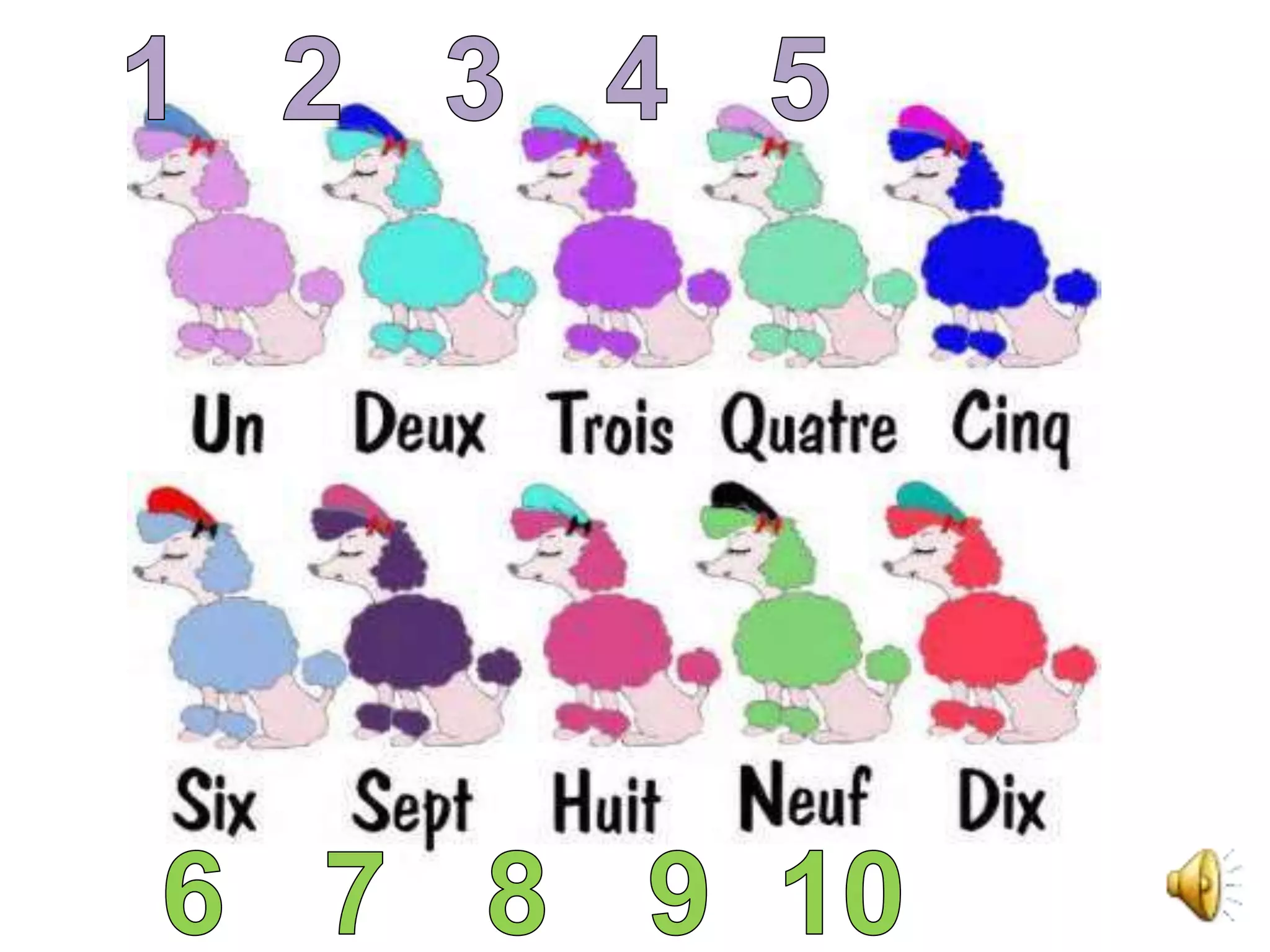 French numbers 1 through 10 are: 1. un 2. deux 3. trois 4. quatre 5. cinq 6. six 7. sept 8. huit 9. neuf 10. dix The document provides French numbers 1 through 10 and recommends several YouTube videos for learning and practicing counting in French.