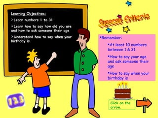 The document contains various exercises to practice these concepts, including typing numbers, stating ages, and giving birthdays in French. It provides feedback on success criteria for remembering numbers and expressing age and birthdays.