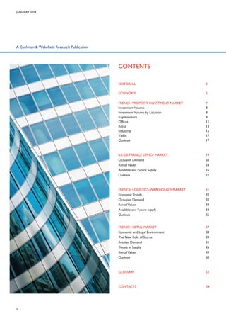 The French property investment market totaled €15.1 billion in 2013, a 1% increase from 2012. While investment volume was stable, the number of transactions declined. Large portfolio deals represented a smaller portion of the market compared to previous years. Office properties accounted for most investment in the Paris region, totaling €11.1 billion or 74% of the French market. Retail properties drove investment in other French regions, totaling €4 billion or 26% of the market. The top investors in France were from France, the United States, and the United Kingdom. The office sector saw more interest in higher risk assets while retail and industrial remained active. Overall, the French market remained stable but uncertainties remained around the economic recovery