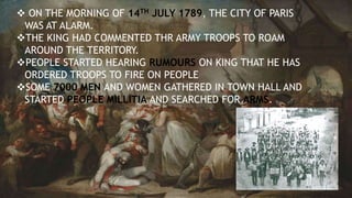 On July 14, 1789, the city of Paris was alarmed as the king had sent troops to patrol the territory. Rumors spread that the king planned to fire on citizens. In response, thousands of citizens gathered, formed militias, and seized weapons and ammunition. They then stormed the Bastille prison and released the prisoners. This marked the beginning of the French Revolution, sparked by economic troubles, inequality, and public unrest. The revolution led to widespread political and social change, including the abolition of the monarchy and establishment of a republic.