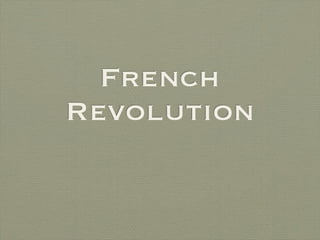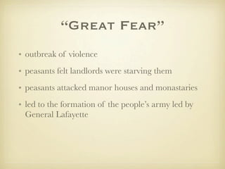 The document summarizes key events of the French Revolution including the "Great Fear" peasant uprising, the storming of the Bastille, emigres fleeing the country and plotting against the revolution, the women's march on Versailles, reforms establishing departments and elections, the Declaration of Rights of Man, the limited constitutional monarchy established in 1791, foreign invasion threatening France, and the end of the monarchy.