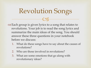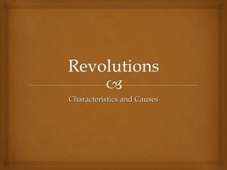 The document discusses the causes and characteristics of revolutions through examining the French Revolution. It identifies several factors that contributed to the revolution including economic struggles, unfair taxation and class divisions between the three estates. The document outlines the major events of the revolution including the storming of the Bastille, the establishment of the National Assembly and the execution of King Louis XVI. It also discusses the rise and fall of Napoleon Bonaparte in the aftermath of the revolution.