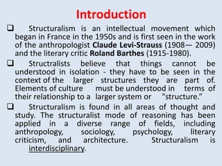 Structuralism began in France in the 1950s through the work of Claude Levi-Strauss and Roland Barthes. Structuralists believe that cultural elements can only be understood in the context of larger structures or systems they are part of. Structuralism analyzes relationships within cultural systems or structures. The structuralist approach originated from Ferdinand de Saussure's work revolutionizing linguistics by focusing on langue, the system of a language, rather than individual utterances. Saussure viewed language as a system of arbitrary signs and emphasized differentiation within the system. Structuralist literary criticism then applied this structuralist approach to analyze relationships within literary texts and systems.