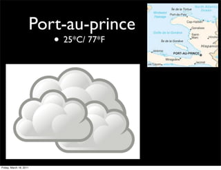 This document provides weather forecasts for several locations on Friday, March 18, 2011. It lists the temperatures in Port-au-Prince, Haiti as 25°C/77°F; Quebec City, Canada as 2°C/35°F; Montreal, Canada as 7°C/45°F; Monaco as 17°C/62°F; and Andorra La Vella as 11°C/52°F. It also provides sources for the temperature and location images.