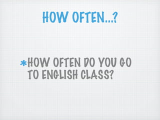 This document discusses words and phrases used to describe frequency or how often something occurs. It provides examples of words like always, never, often, usually, and their use in sentences. It also covers negatives like "don't" and "doesn't", the use of "to be" with these words, and use of "every" and "once" to indicate specific frequencies like daily, weekly, or monthly.