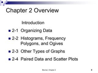 The document summarizes key concepts from Chapter 2 of a statistics textbook. Section 2-1 discusses organizing raw data into frequency distributions, including categorical and grouped frequency distributions. Section 2-2 covers three common graphs used to represent frequency distributions: histograms use class boundaries and frequencies, frequency polygons use class midpoints and frequencies, and ogives use class boundaries and cumulative frequencies. Examples are provided for constructing each type of graph. Relative frequency graphs that use proportions rather than frequencies are also discussed.