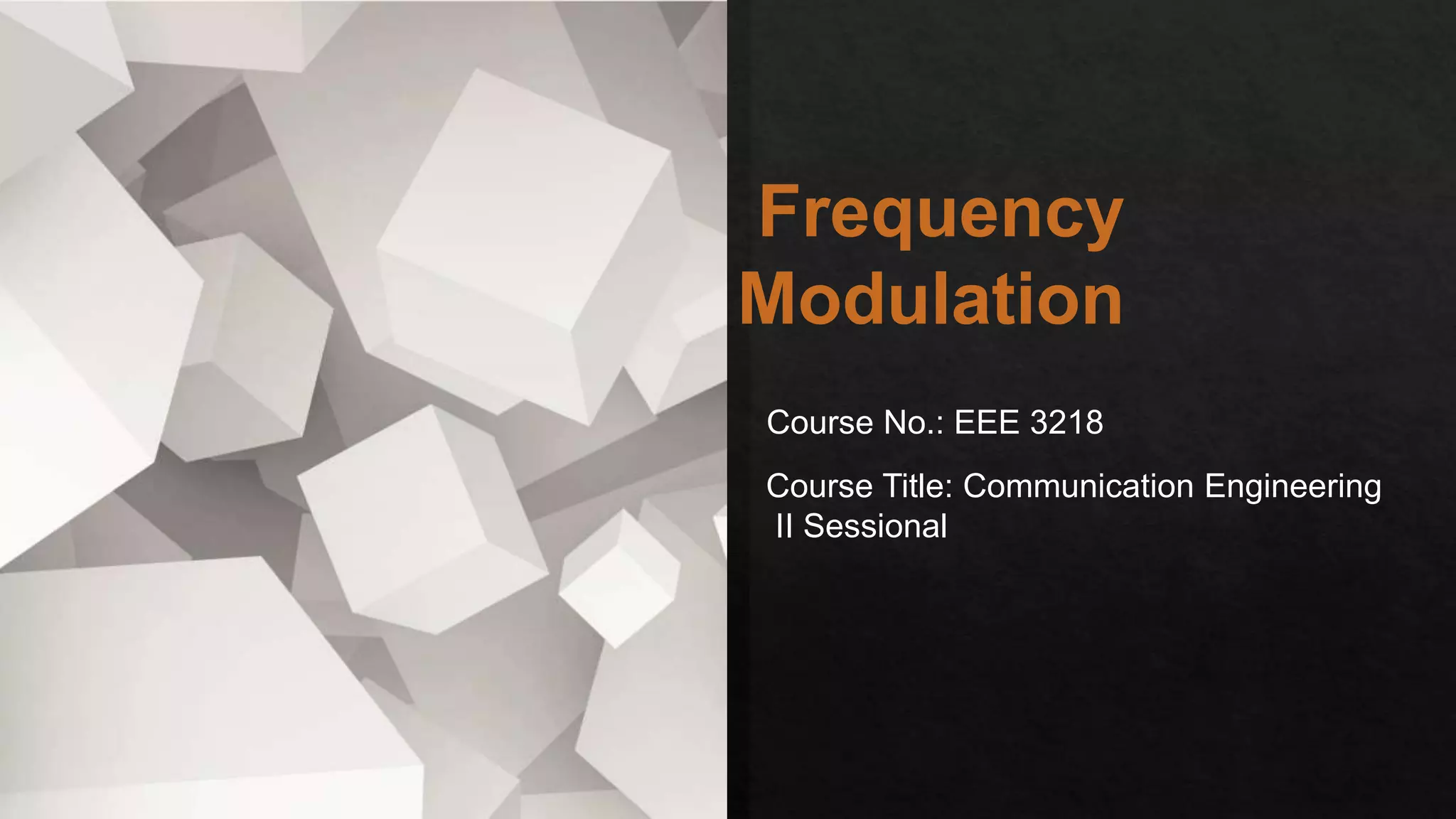This document provides an overview of frequency modulation (FM). It defines FM as a modulation technique where the amplitude of the carrier signal remains constant while its frequency varies according to the modulating signal. The document discusses the need for modulation, classification of modulation techniques, FM theory, generation of FM signals in the lab using a function generator and FM modulator kit, experimental input/output waveshapes, advantages/disadvantages of FM, and applications of FM such as FM radio broadcasting, telemetry, radar, and music synthesis.