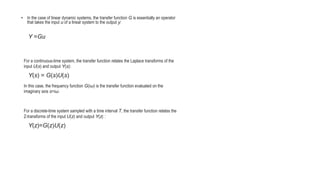 Frequency response plots show how a linear system responds to signals of different frequencies. They relate the input and output signals in the frequency domain. For continuous systems, the transfer function relates the Laplace transforms of the input and output. For discrete systems, it relates the Z-transforms. Frequency response plots provide insight into a system's frequency-dependent gains, resonances, and phase shifts. Common types of frequency response plots include Bode plots, which show magnitude and phase response on logarithmic frequency axes, and Nyquist plots, which show the transfer function in the complex plane. Stability can be assessed from these plots by examining properties like phase and gain margin.