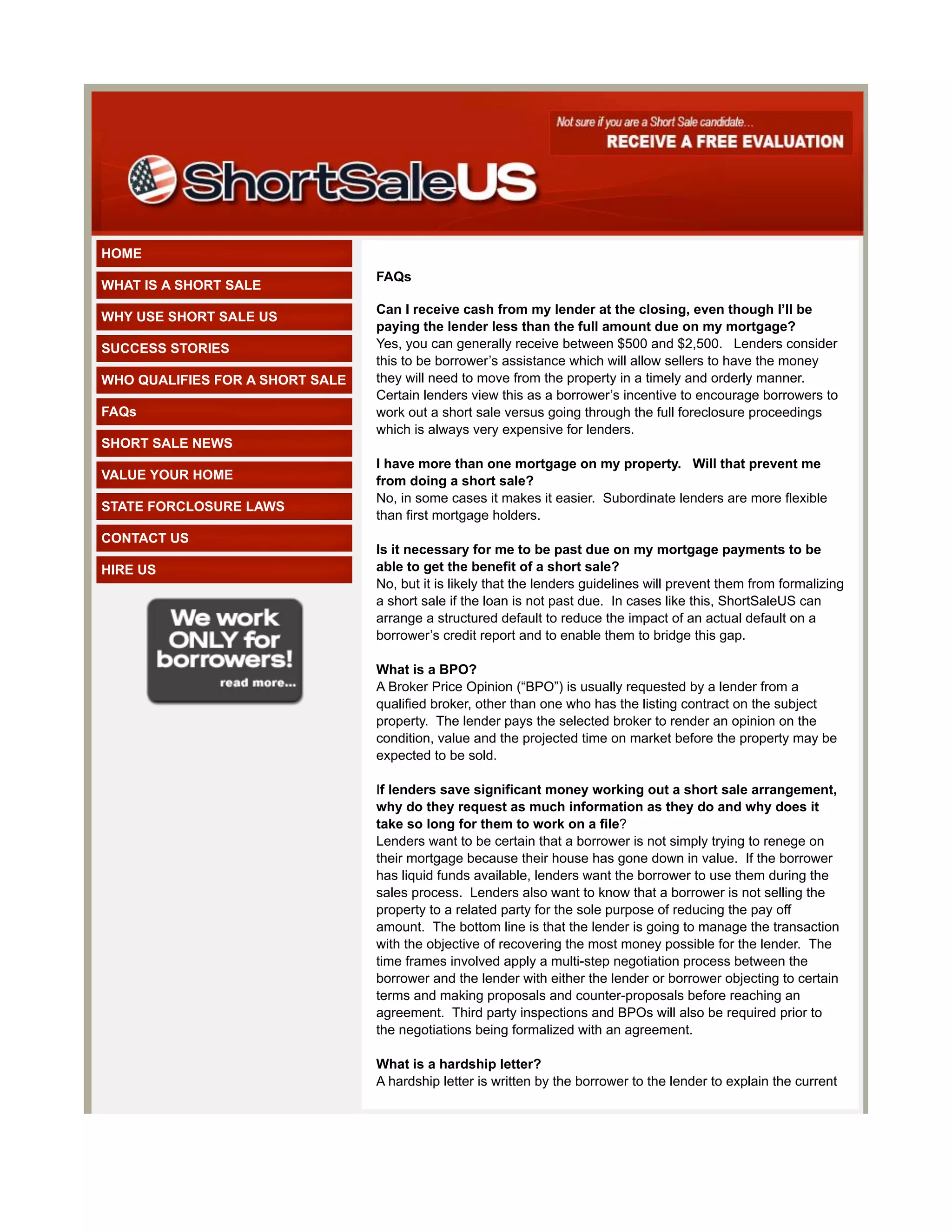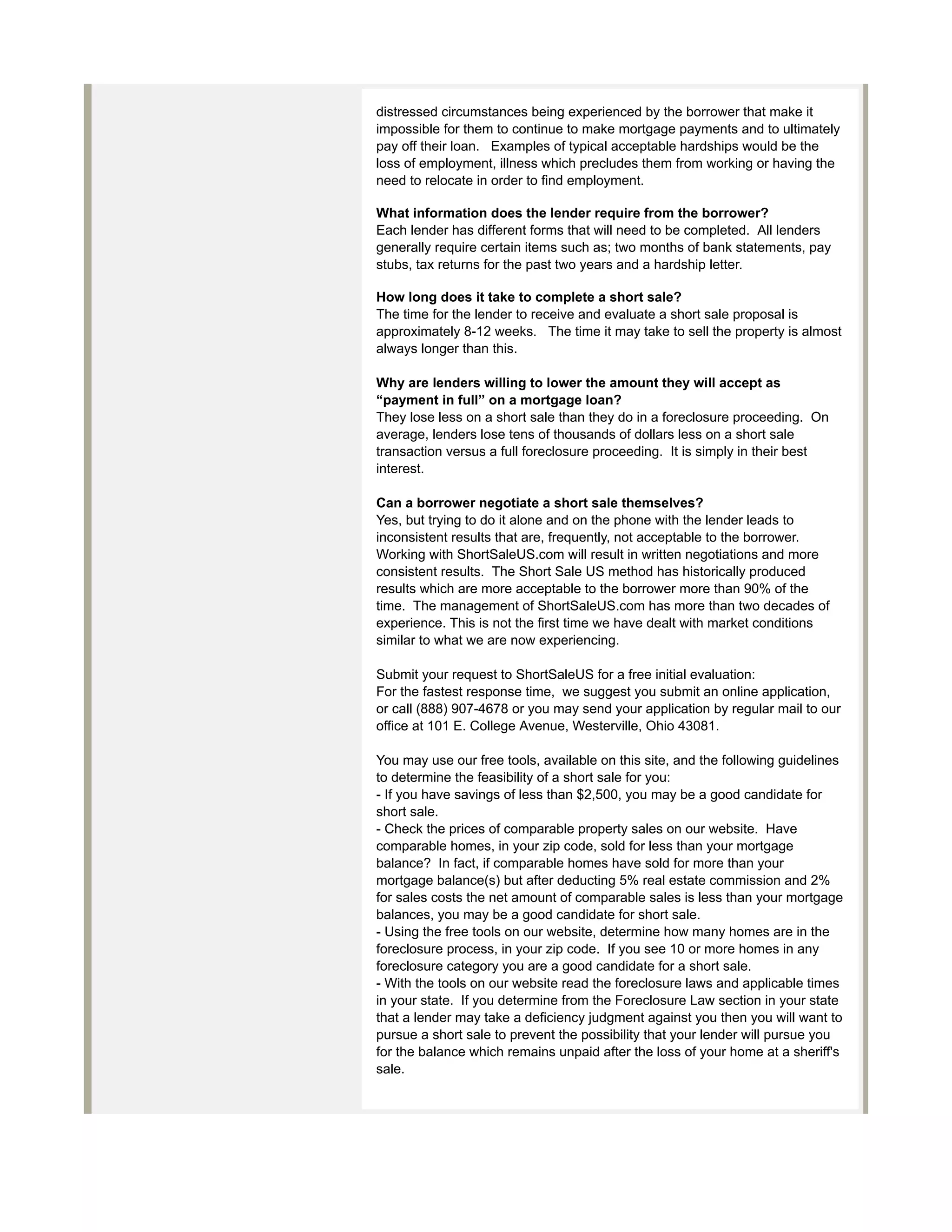 The document provides answers to frequently asked questions about short sales. It discusses topics such as whether borrowers can receive cash from lenders at closing, how to qualify for a short sale with multiple mortgages or if payments are current, the short sale process timeline, and potential tax implications of debt forgiveness. Key details requested by lenders are explained, such as hardship letters, documents required, and reasons lenders are willing to accept less than the full mortgage amount in a short sale.