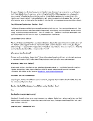 Access Bars™ involves a session where 32 points on the head are lightly touched to release old energies stored in the brain and body, resulting in greater ease and peace in life. The effects can vary but typically include increased relaxation and changes in mental clarity, and sessions are recommended regularly for sustained benefits. This technique can be beneficial for people of all ages, including children and pregnant women, and requires no prior experience to learn.