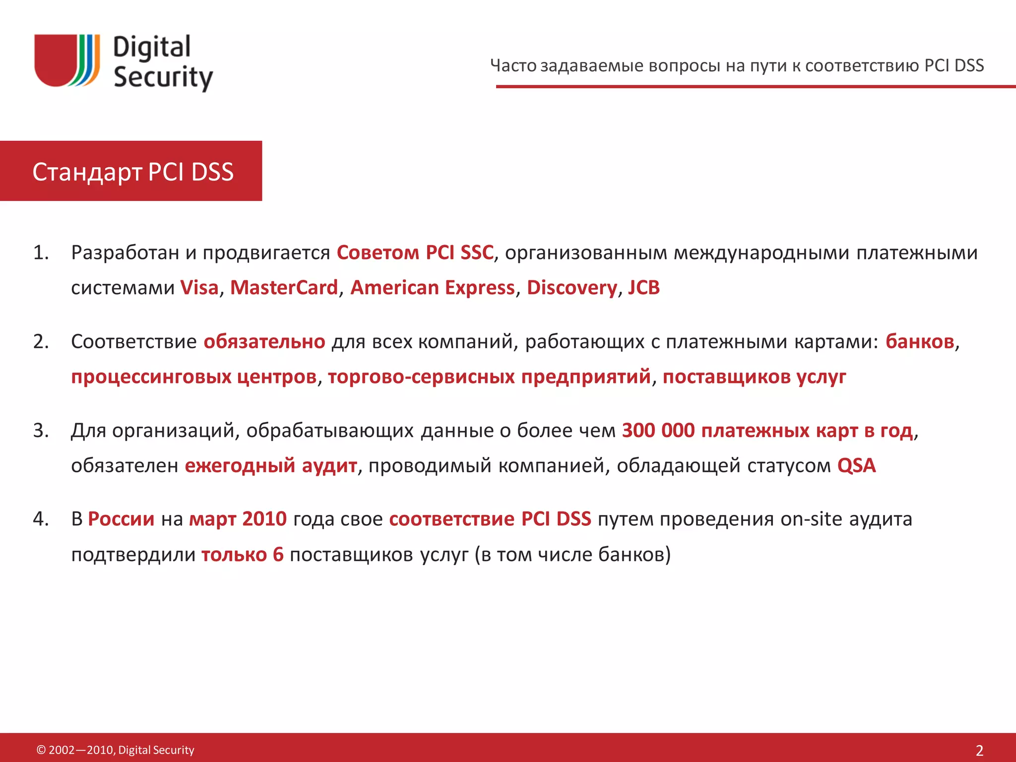 Документ описывает частые вопросы и этапы прохождения сертификации PCI DSS, обязательной для всех организаций, работающих с платежными картами. Включает детали о необходимых аудитах, требованиях к безопасности, шифрованию данных и удаленному доступу, а также правилам документирования и протоколирования. Приведены рекомендации по повышению эффективности процессов безопасности и обработки данных держателей карт.