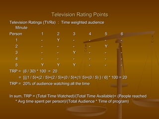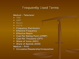 The document outlines various terminologies and metrics used in media analysis, particularly focusing on television and print advertising, including concepts like reach, frequency distribution, gross rating points (GRP), and cost per rating point (CPRP). It explains the importance of effective reach and frequency in advertising campaigns to ensure desired audience exposure. Additionally, it provides examples and formulas for calculating share of voice (SOV) and share of spends (SOS) for brands within their respective market categories.