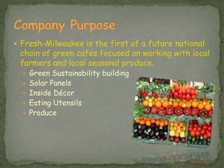 Fresh-Milwaukee is a proposed locally focused café/deli that will source ingredients from local farmers and focus on seasonal, sustainable produce. It aims to be the first location of a national green café chain. The café will have solar panels, eco-friendly décor and utensils, and source all produce locally. It will educate customers about urban farming and green building practices.