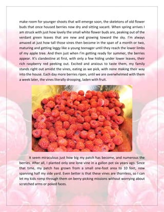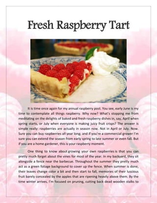 The document discusses the author's annual raspberry harvest from their backyard raspberry patch. It describes the growth cycle of the raspberry vines throughout the year and their excitement as the berries start to ripen in large quantities each summer. This year, the author decides to make a fresh raspberry tart using their bountiful harvest. The tart is assembled with a homemade pastry cream and flaky pie crust, layered with fresh raspberries. Recipes for the pastry cream, pie crust, and tart are included.