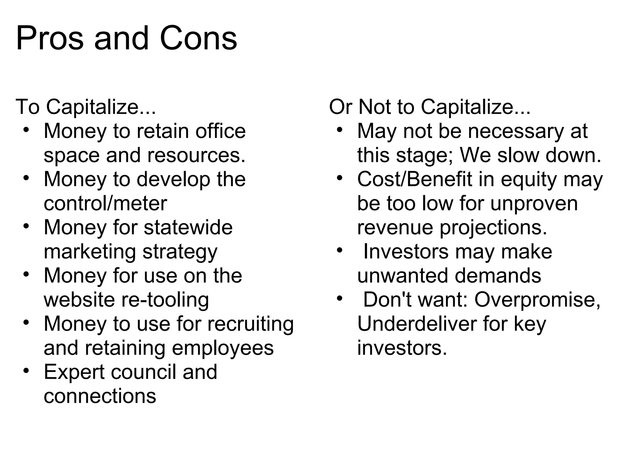 FreshTek is considering whether to seek capitalization to fund office space, marketing, website development, and hiring. While capitalization could provide resources, it may slow growth and require giving up equity. FreshTek currently earns $2,500-$3,500 per month installing solar products and developing a network of installers in Florida. Its vision is to standardize performance tracking for solar thermal to increase its adoption and profitability.
