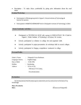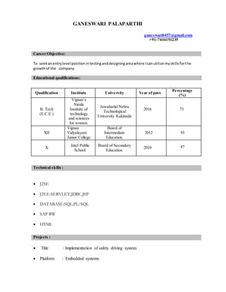 Ganeswari Palaparthi is seeking an entry-level position in testing and designing, leveraging her skills for company growth. She holds a B.Tech in Electronics and Communication Engineering with a percentage of 73 from Vignan's Nirula Institute and has experience in various technical projects, including an implementation of a safety driving system. Ganeswari is skilled in languages such as English and Telugu, and actively participated in extracurricular activities and technical workshops.