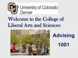 This document provides an overview of the College of Liberal Arts and Sciences advising system at the University of Colorado Denver. It discusses the benefits of a liberal arts education, the shared responsibilities of students, faculty advisors, and professional advisors. It also outlines the core curriculum and graduation requirements, including completing 120 total credit hours with at least 45 being upper division courses and maintaining a minimum 2.0 GPA. Major and minor requirements are also briefly explained.
