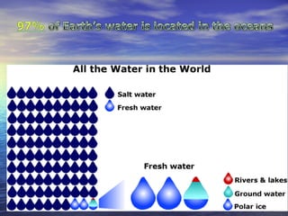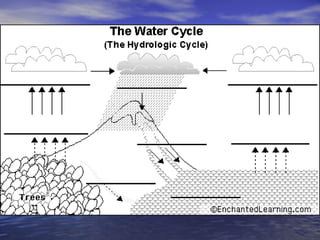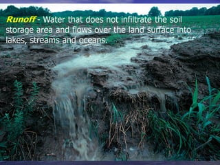 Earth has a unique combination of water in its atmosphere, oceans, and land. The water cycle describes the continuous movement of water on, above, and below the Earth's surface through different states of matter and includes precipitation, infiltration, storage, and evaporation. Below the surface, groundwater flows through zones of saturation and aeration within permeable rocks and soils called aquifers, eventually emerging in springs, streams or being used by humans.