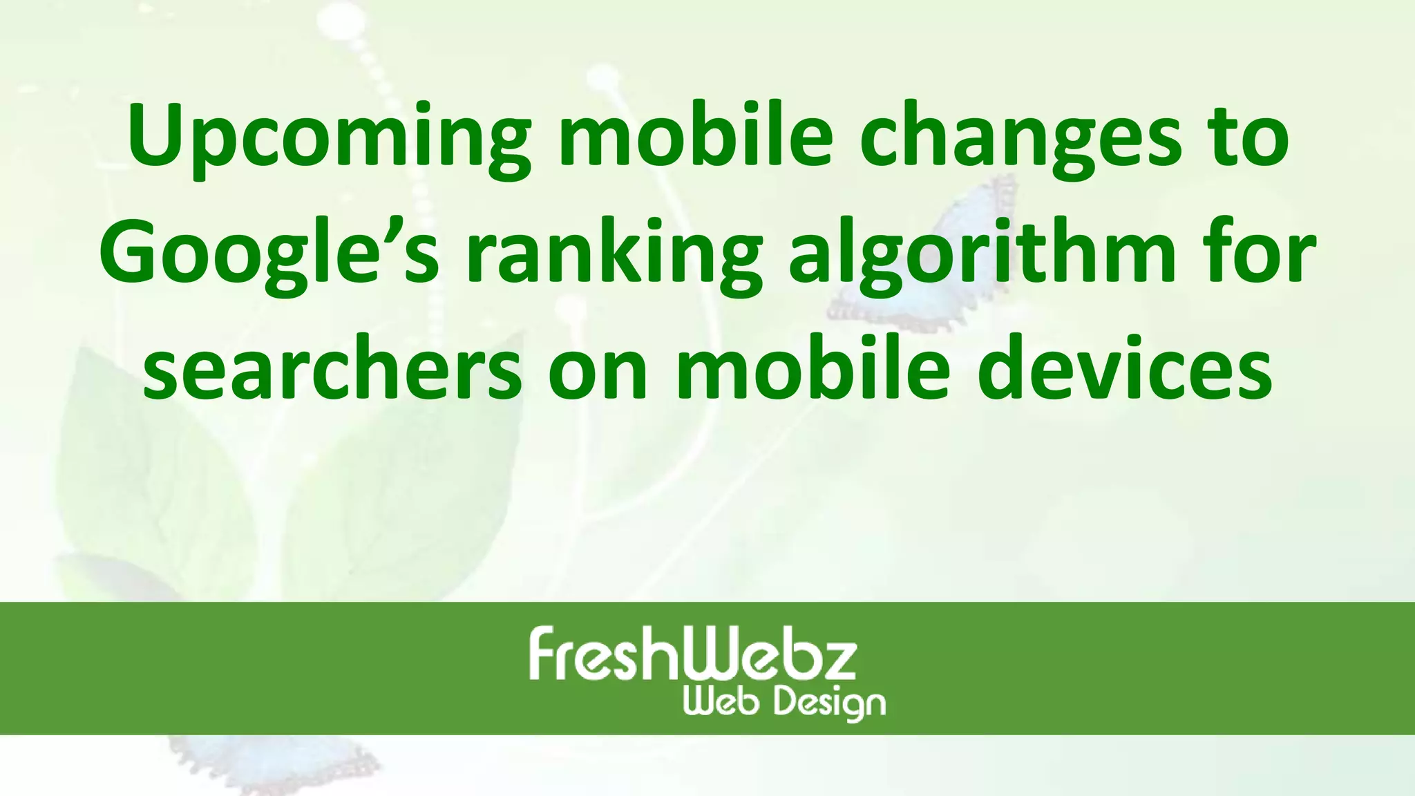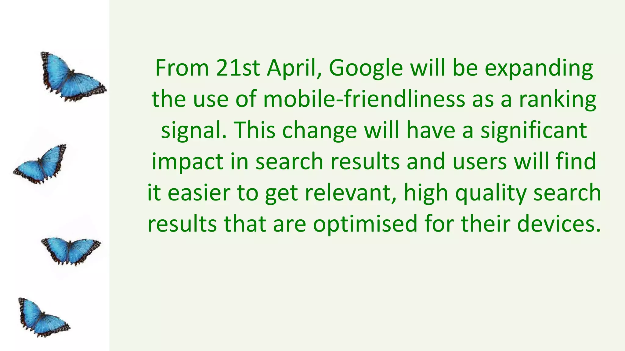 Google will expand the use of mobile-friendliness as a ranking signal beginning April 21st. This change will make mobile search results more relevant and high-quality for users. Google will assess all websites for mobile-friendliness and include this as a factor in its algorithm. For a site to pass as mobile-friendly, all pages must be optimized for mobile viewing on an individual basis. Sites must also allow Google to crawl CSS and JavaScript files. While responsive design is recommended, other mobile optimization methods will not be penalized. Websites can test mobile-friendliness using Google's mobile-friendly test and mobile usability report in Search Console.