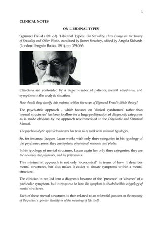 Freud's theory of libidinal types provides a minimal typology to help clinicians classify patients' mental structures and symptoms. The three main libidinal types are erotic, obsessional, and narcissistic. The erotic type prioritizes love and being loved. The obsessional type is dominated by the superego and fears conscience and dependence. The narcissistic type seeks to impress others and feel larger than life. These types can present alone or combined, and correlate with different neuroses when illness occurs. Freud's typology clarifies vast clinical data and orients diagnosis and treatment in the psychoanalytic clinic.