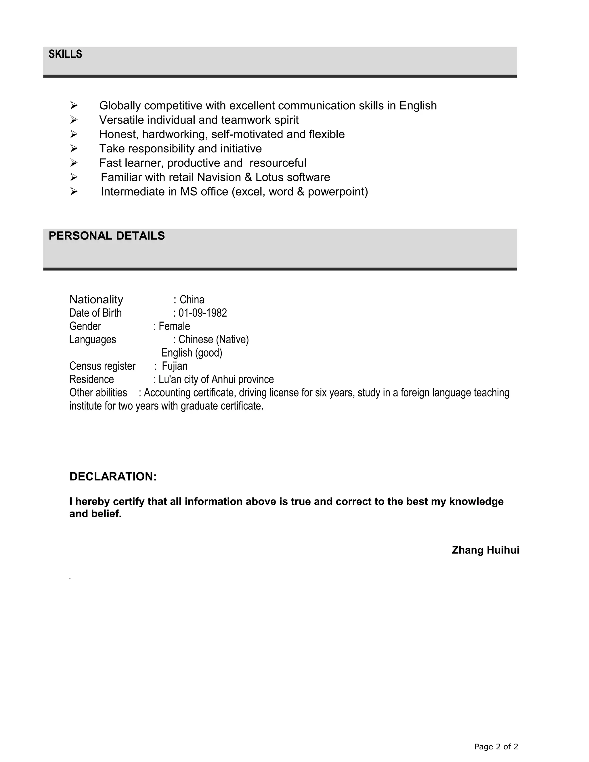 This document contains Zhang Huihui's resume. It summarizes her educational and professional experience working in marketing and accounting roles for shoe companies in China from 2000 to 2015. Her skills include strong communication abilities in English and Chinese, teamwork, initiative, and proficiency in Microsoft Office and retail software. She seeks to utilize her experience in customer service, merchandising, and operations on Taobao.com and Tmall.com.