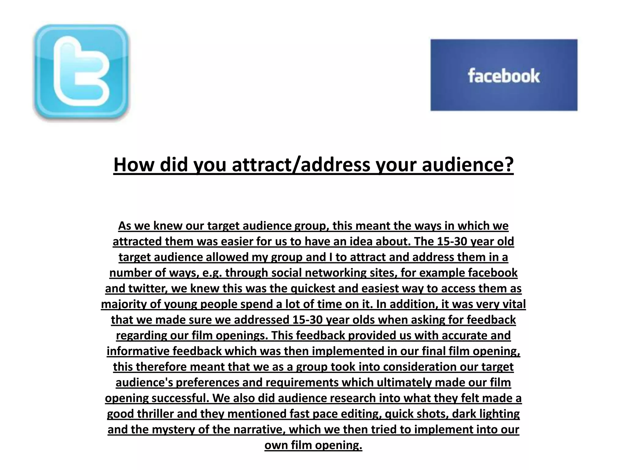 The group attracted their target audience of 15-30 year olds through social media like Facebook and Twitter. They addressed this age group when asking for feedback on their film opening. This feedback helped them implement the audience's preferences into the final opening. The group also researched what makes a good thriller for this audience and incorporated fast pacing, quick shots, dark lighting, and mystery into their own opening based on the feedback.