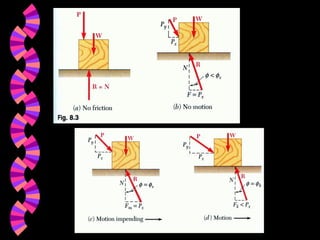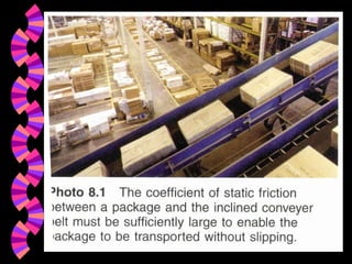 The document discusses friction and its relationship to static and kinetic forces. Static friction acts before motion, while kinetic friction acts during motion. Both are related to the normal force and can be expressed using coefficients of friction. Common friction problems involve determining if motion will occur based on applied forces and coefficients, or finding coefficients given force conditions. Sample problems demonstrate setting up force diagrams and equations to solve these types of problems.