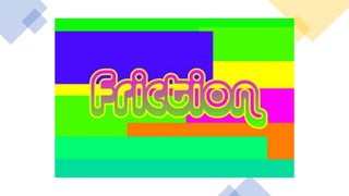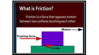 The document discusses the dual role of friction in physics, highlighting how it aids in movement, such as enabling cars to start and stop, while also causing wear and heat in mechanical parts. It explains the factors that influence friction, including surface roughness and the force applied, and differentiates between types of friction: static, sliding, rolling, and fluid. The document also illustrates practical applications of friction in everyday scenarios, such as the use of lubricants and materials designed to reduce friction in machinery and sports.
