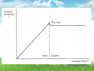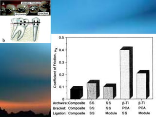 The document discusses the principles and factors influencing friction in orthodontic tooth movement, focusing on the interactions between brackets and archwires. It covers various aspects such as materials, bracket design, and environmental conditions that affect friction, and emphasizes the importance of understanding these elements for efficient orthodontic treatment. Key points include the analysis of different bracket materials, the influence of archwire properties, and the mechanics of friction in the context of orthodontic appliances.