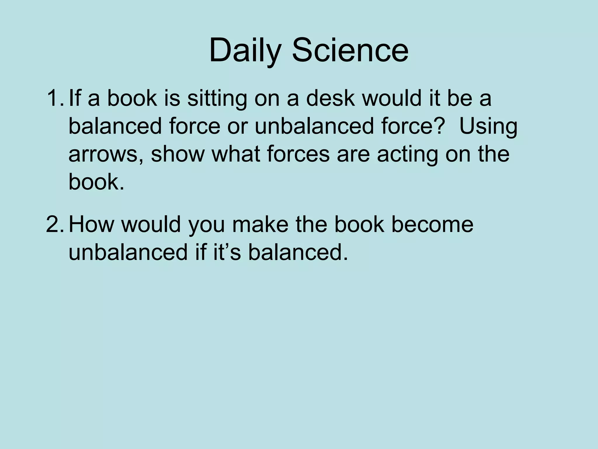 The document discusses different types of forces and friction. It begins by asking about balanced and unbalanced forces on a book sitting on a desk. It then lists several scenarios involving objects in motion and asks about similarities between them. The document goes on to define friction as the force between two surfaces in contact, and identifies the two main factors that affect friction as the pressure between surfaces and their material composition. It outlines the four types of friction - static, sliding, rolling, and fluid friction - and provides examples of each type.
