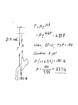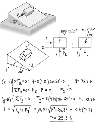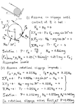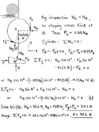 This document contains multiple physics problems related to forces, friction, and equilibrium. It asks the reader to calculate forces required to initiate movement given masses and friction coefficients, determine ranges of mass where systems are in equilibrium, find maximum thicknesses before slipping occurs, and compute moments and forces for various objects in contact based on specifications provided.