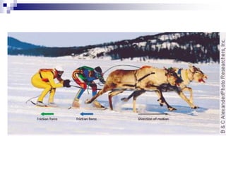 This document discusses friction and its effects. It explains that friction is the force that surfaces exert on each other when rubbing together, and it acts in the opposite direction of an object's motion. There are different types of friction, including static friction which acts on non-moving objects, sliding friction when surfaces slide against each other, rolling friction when objects roll, and fluid friction when objects move through fluids. Friction depends on factors like the roughness of surfaces and how hard they are pressed together.