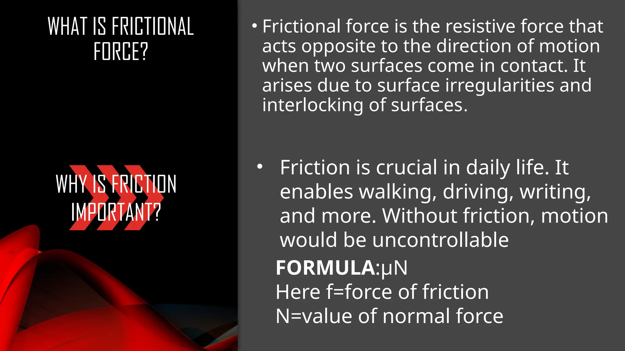 The document explains frictional force as a resistive force acting opposite to motion, emphasizing its importance in daily life, such as walking and driving. It discusses types of friction (static, kinetic, rolling, and fluid) and their applications in both nature and technology, along with key factors affecting friction. Additionally, it includes equations related to friction and practical problems that illustrate its role in motion control.