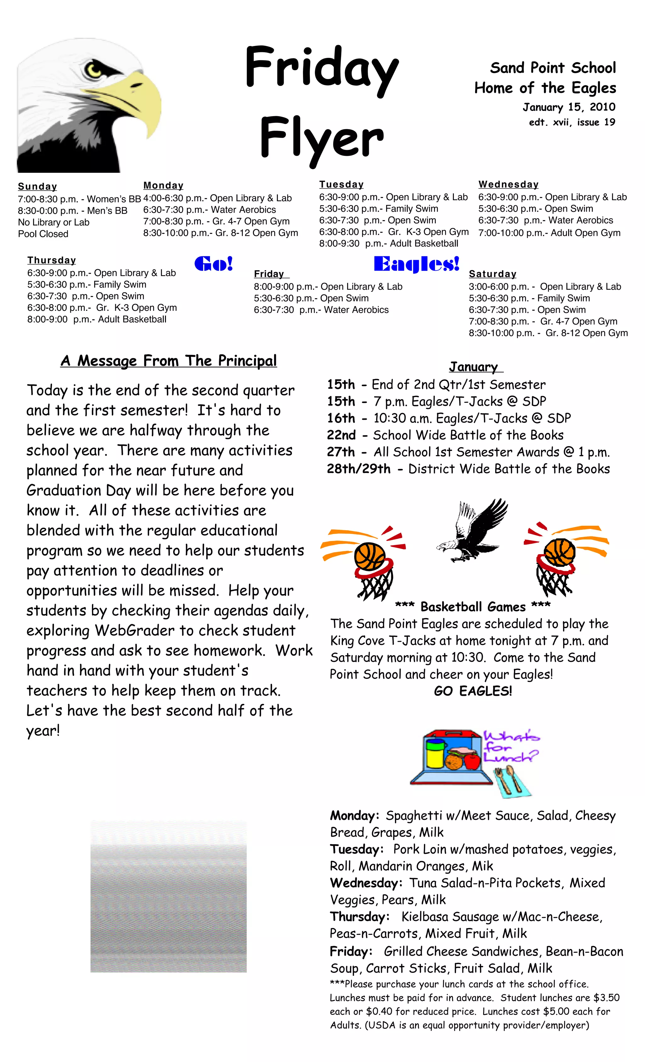 This document is a newsletter from Sand Point School in Alaska dated January 15, 2010. It includes schedules for activities at the school such as open gym times, library hours and sports games. It also lists the school lunch menu for the week and provides updates on upcoming events like the end of the second quarter, a geography bee and a raffle fundraiser. A section recognizes top students in an accelerated reading program and announces the opening of a new teen center in the community.