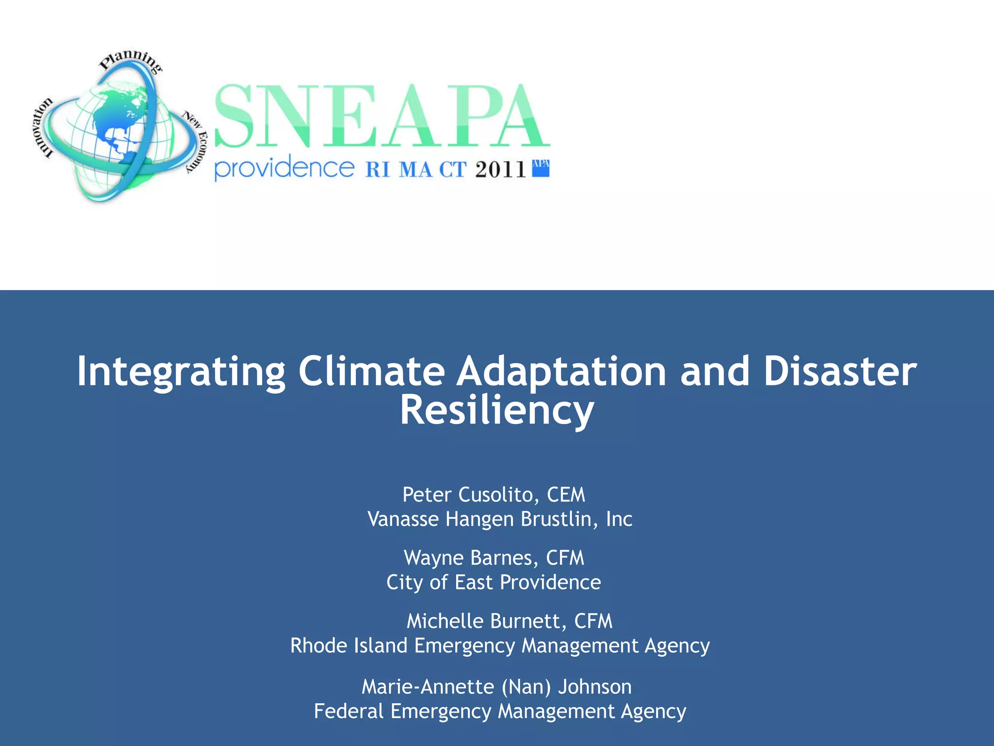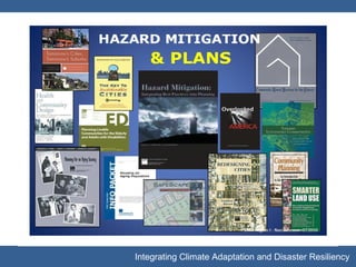 This document discusses integrating climate adaptation and disaster resiliency. It outlines the importance of hazard mitigation in developing sustainable communities. The main components of the hazard mitigation planning process are detailed, including developing goals and objectives, identifying mitigation actions, and prioritizing actions. Federal programs that support hazard mitigation planning and project funding are also summarized.