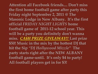 The document announces an after party following the first New Albany high school football game of the season on September 2, 2011 at the Masonic Lodge in New Albany. The party will feature cash prizes, music by DJ Hollywood Mizzle, and will run from the end of the football game until late. Surrounding communities are invited to the after party for $4 admission or $3 for football players.