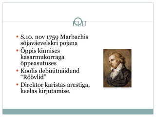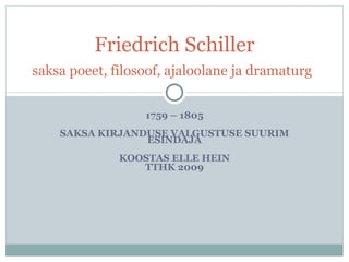 1759 – 1805SAKSA KIRJANDUSE VALGUSTUSE SUURIM ESINDAJA KOOSTAS ELLE HEIN TTHK 2009 Friedrich Schiller saksa poeet, filosoof, ajaloolane ja dramaturg