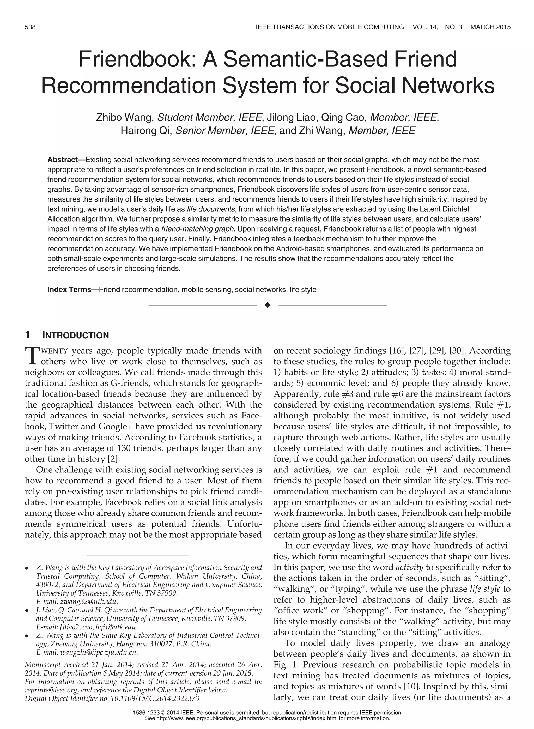 Friendbook is a semantic-based friend recommendation system that utilizes user lifestyle data extracted from smartphone sensors to suggest friends based on lifestyle similarities rather than social graph connections. The system employs a probabilistic topic model to analyze users' daily routines, which are modeled as 'life documents,' and uses a unique similarity metric to make recommendations. Friendbook aims to improve recommendation accuracy through a feedback mechanism and has demonstrated effectiveness in experiments and simulations.