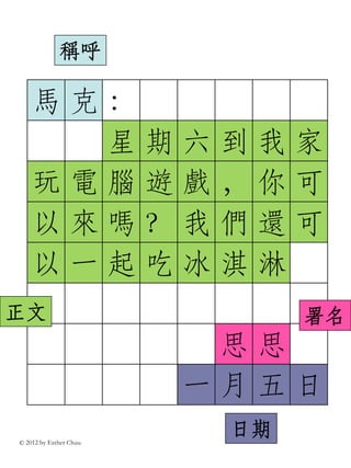 期 六 到 我 家 玩 電 腦 遊 戲 , 你 可 以 來 嗎 ? 我 們 還 可 以 一 起 吃 冰 淇 淋 思 思 一 月 五 日 稱呼 正文 署名 日期 ©ゥ 2012 by Esther Chau