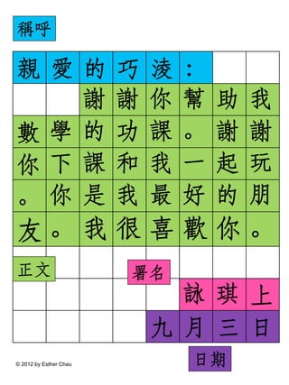 我 很 喜 歡 你 。 詠 琪 上 九 月 三 日 稱呼 正文 署名 日期 © 2012 by Esther Chau