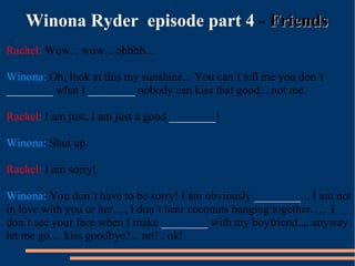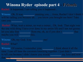 Rachel tells her friends that she had a wild one-night stand with Winona Ryder. When Rachel runs into Winona, Winona denies that anything happened between them. Rachel convinces Winona to admit the truth by reminding her of intimate details from their night together. Winona confesses that she has been thinking about Rachel and the encounter frequently. While Rachel is surprised by this revelation, Winona insists that she is not in love with Rachel and was merely confused by the passionate connection they shared.
