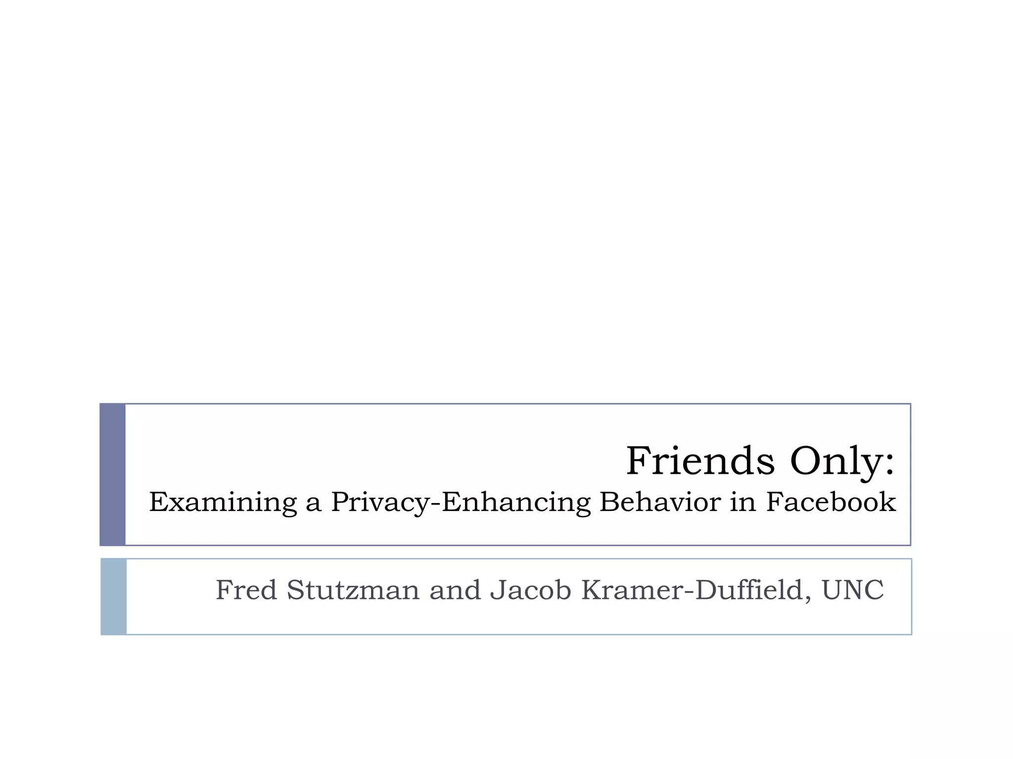 This document summarizes a study examining factors associated with users making their Facebook profiles only visible to friends. The study analyzed survey responses from 444 Facebook users. Models tested included demographic factors, rule development around disclosure to ties, boundary coordination of expected audiences, and boundary turbulence from privacy management experiences. The boundary coordination model found expectancy violations from weak ties increased odds of a friends-only profile. The boundary turbulence model found more privacy management led to friends-only profiles. The models provide insights into the dynamic process of boundary regulation on social networks.