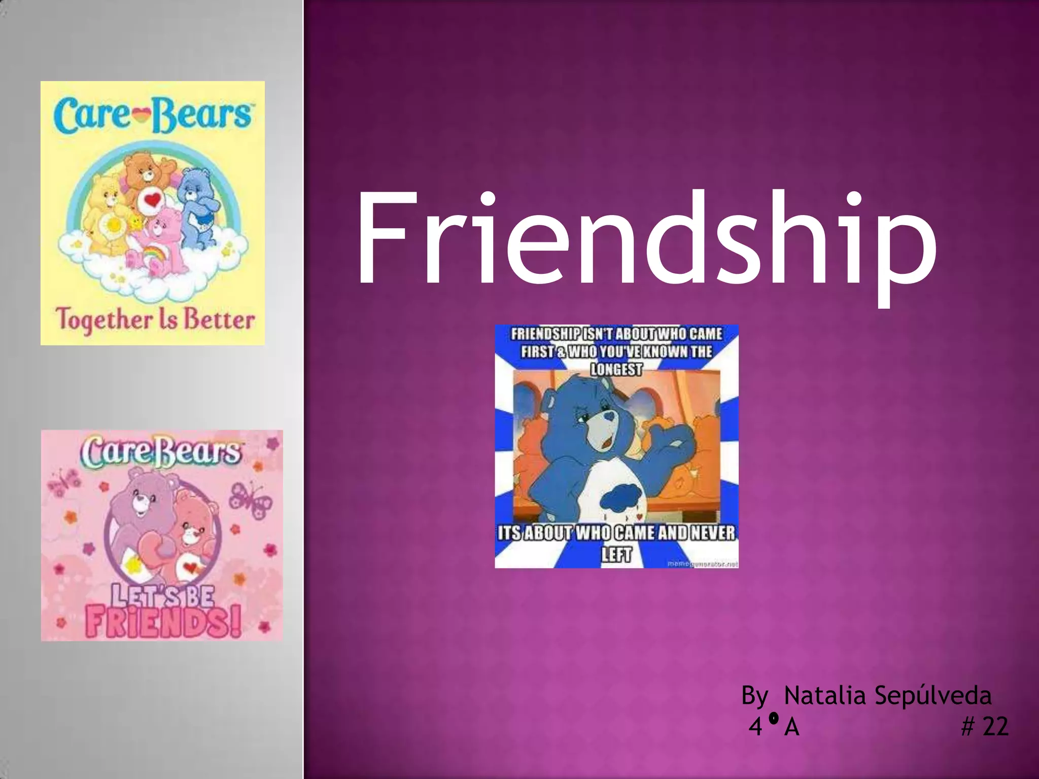 Friendship is a relationship between two people who hold mutual affection for each other. Friendship is about loving somebody simply for being your friend. Friends love each other and provide companionship.
