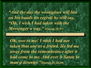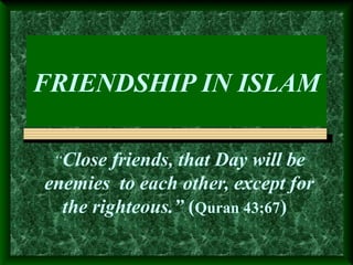 This document discusses the importance of choosing friends wisely in Islam. It notes that on the Day of Judgment, wrong friends will become enemies and lead people away from guidance. True friendship in Islam involves encouraging one another to obey Allah, draw closer to Him rather than each other, and avoid wasting time. Hadiths emphasize loving others for Allah's sake alone. Friends should help each other spiritually, not distract from remembrance of God or lead into sin. The highest friendship is for the sake of Allah that will be rewarded with His love, protection and paradise.