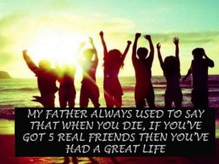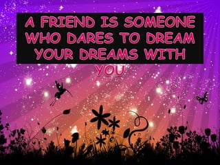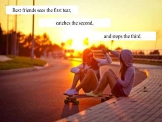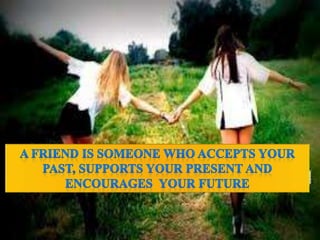 This document contains quotes and sayings about the importance of friendship. It defines what good friends do for each other, such as fight for you, respect you, involve you and encourage you. It also emphasizes that true friends are always there for you, even if you don't see them, and would help catch you if you fell instead of jumping off a bridge with you. Overall the document celebrates friendship and the happiness it brings.