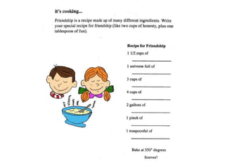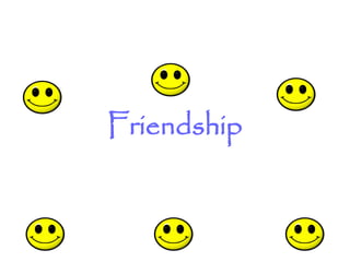 This document discusses the benefits of friendship, different types of friendships, and qualities of good friendships. It notes that friendships can provide fun, support, understanding, a sense of usefulness, and a place to be yourself. Good friendships are based on shared interests, values, trust, honesty, respect, and support. The document provides tips for making friends, such as participating in shared interests, being cheerful, accepting others' flaws, compromising, and choosing friends who don't pressure you to do harmful things. The overall message is that to have a good friend, one must also be a good friend.