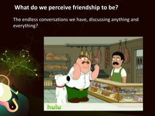 The document explores the profound nature of friendship, highlighting it as an enduring emotional bond that shapes our experiences and identities. It reflects on the shared moments and connections we create with friends and even pets, emphasizing that these relationships significantly enrich our lives. The author encourages readers to appreciate the friendships they have and consider what life would be like without them.