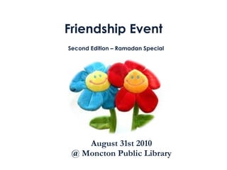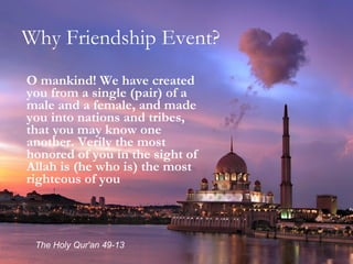 The document discusses various aspects of fasting and community during Ramadan according to Islamic teachings. It covers fasting as one of the five pillars of Islam, its benefits on personal and community levels, and emphasizes feeling for the poor by putting oneself in their situation. It also discusses the financial aspect of zakat and charity, balancing wealth without waste or oppression, and creating unity through community iftar meals.