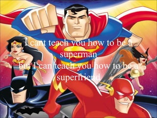 This document provides guidance for children on how to be a "super friend" when playing with others. It encourages asking permission before taking toys, using gentle hands and words, taking turns, and going with the flow instead of getting upset. It also advises children to stop, think about what a super friend would do, and ask an adult for help if still feeling frustrated or angry.