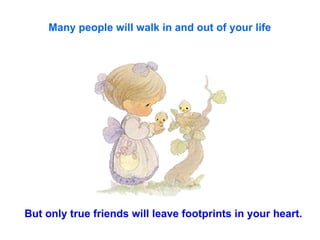 This document discusses the importance of friendship and true friends. It provides short quotes and sayings about how friends leave footprints in our hearts, how to handle people using heart over head, how losing faith loses all, and how beautiful old people are works of art. The document encourages sharing with friends to show you care during National Friendship Week and completing a circle of friends by sending it to others.